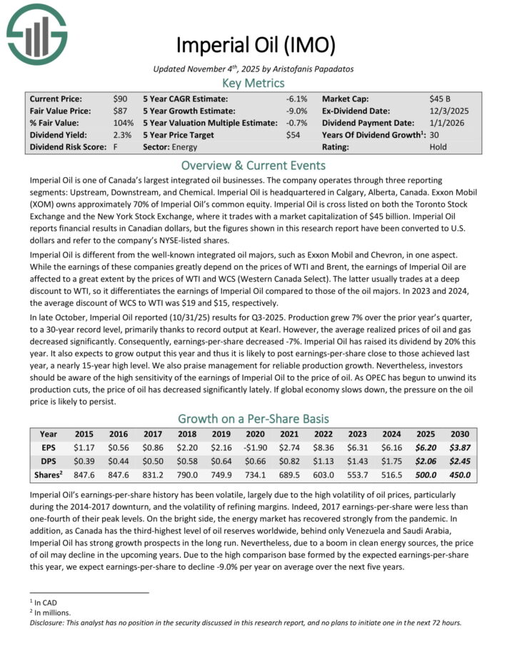 Imperial Oil stories monetary ends in Canadian {dollars}, however the figures proven on this analysis report have been transformed to U.S. {dollars} and discuss with the corporate’s NYSE-listed shares.
