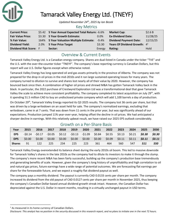 Tamarack Valley Vitality Ltd. is a Canadian vitality firm. Shares are dual-listed in Canada underneath the ticker “TVE” and the U.S. with the over-the-counter ticker “TNEYF”.